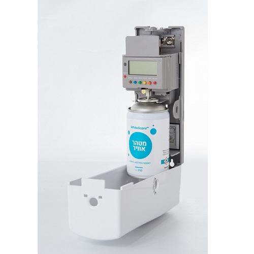 מכשיר ריח מסוג אירוסול עם צג דיגיטלי, הניתן לכיוון השעות וזמני הפצת הריח. עד 2,500 התזות בחודש. עובד על סוללות מסוג אלקלאין size D. מתאים לחדרים וחללים קטנים כגון: חדרי שירותים.