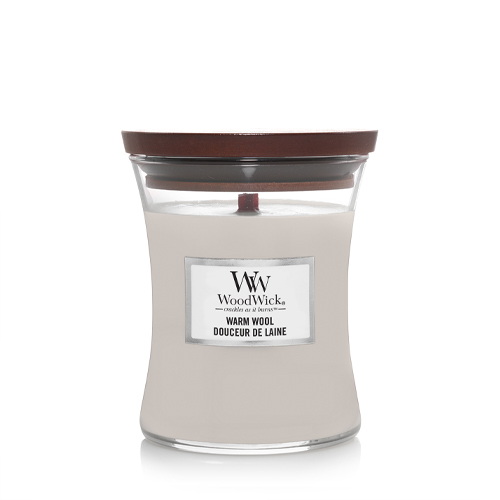 נר שעון חול 275 גרם מבית WoodWick בניחוח Warm Wool