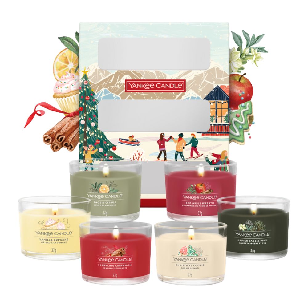 מארז מתנה קסום ומפנק שכיף לקבל, המכיל 6 נרות VOTIVE יצוקים לזכוכית בניחוחות חורפיים שמחממים את הלב.