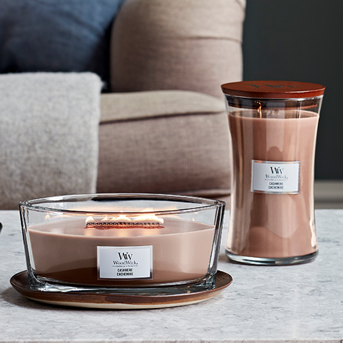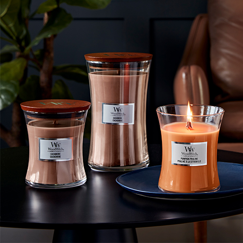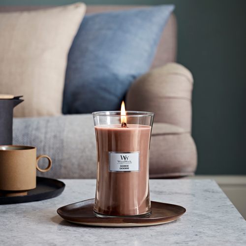 נר ריחני גדול 610 גרם יצוק לזכוכית מהודרת בעיצוב של שעון חול, בעל מכסה דקורטיבי מעץ.