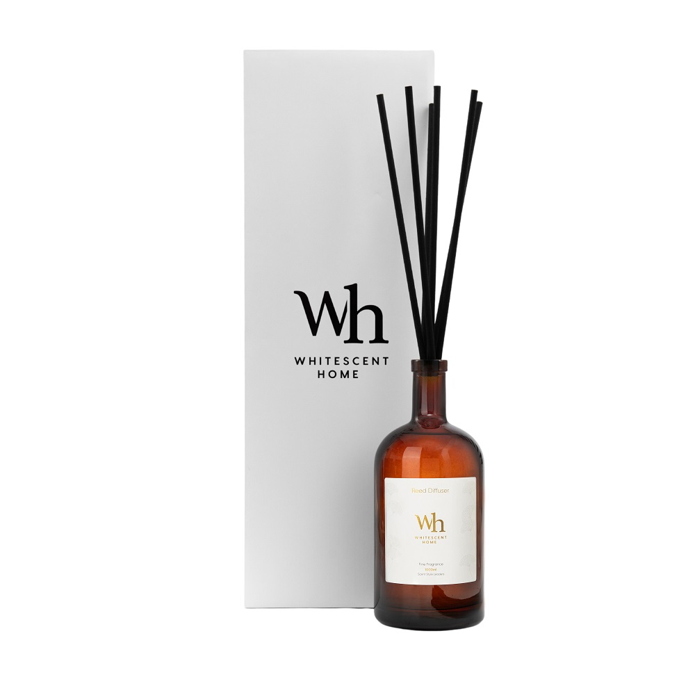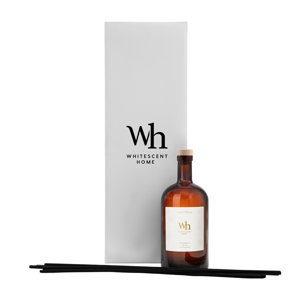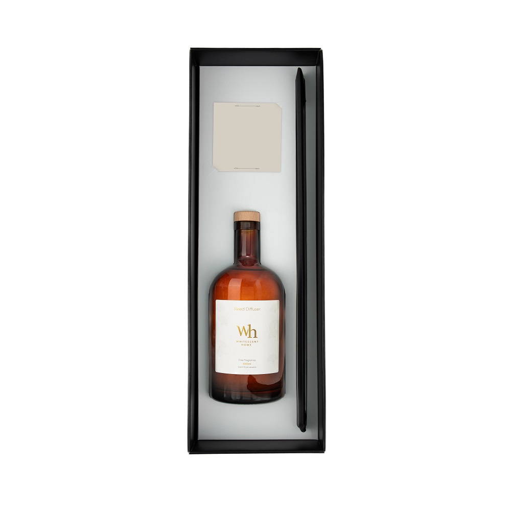 ניחוח לבחירה משמנים איכותיים, בבקבוק זכוכית בגוון אמבר ומקלות ריח שחורים.
