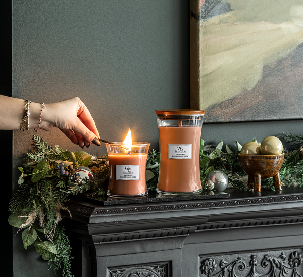 נר ריחני גדול 610 גרם יצוק לזכוכית מהודרת בעיצוב של שעון חול, בעל מכסה דקורטיבי מעץ.